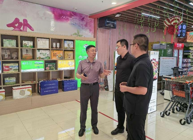 6月21日,赤峰市政府辦公室副主任青龍在中心城區(qū)調研“赤誠峰味”商超展示工作開展情況,赤峰市城市建設投資(集團)有限公司“赤誠峰味”品牌運營推進專班成員陪同調研。