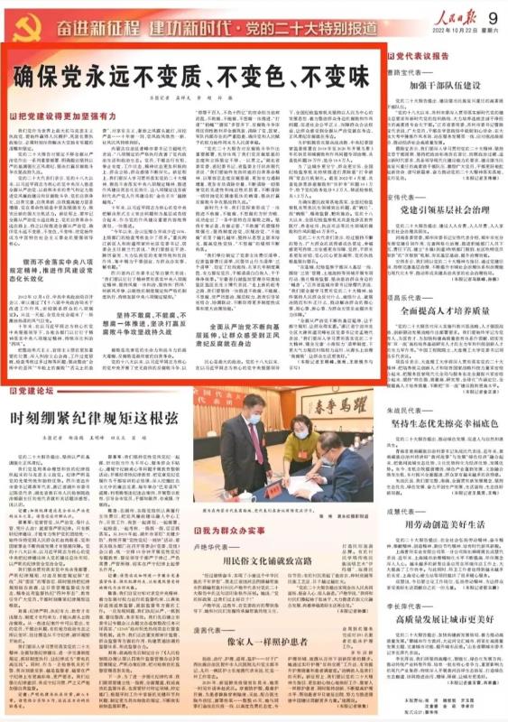 黨的二十大代表們表示,黨的十八大以來,以習(xí)近平同志為核心的黨中央深入推進(jìn)全面從嚴(yán)治黨,以前所未有的勇氣和定力推進(jìn)黨風(fēng)廉政建設(shè)和反腐敗斗爭(zhēng),黨的自我凈化、自我完善、自我革新、自我提高能力顯著增強(qiáng),黨在革命性鍛造中更加堅(jiān)強(qiáng)有力,煥發(fā)出新的強(qiáng)大生機(jī)活力。新征程上,要牢記全面從嚴(yán)治黨永遠(yuǎn)在路上,黨的自我革命永遠(yuǎn)在路上,持之以恒推進(jìn)全面從嚴(yán)治黨,確保黨永遠(yuǎn)不變質(zhì)、不變色、不變味,使黨始終成為中國(guó)特色社會(huì)主義事業(yè)的堅(jiān)強(qiáng)領(lǐng)導(dǎo)核心。